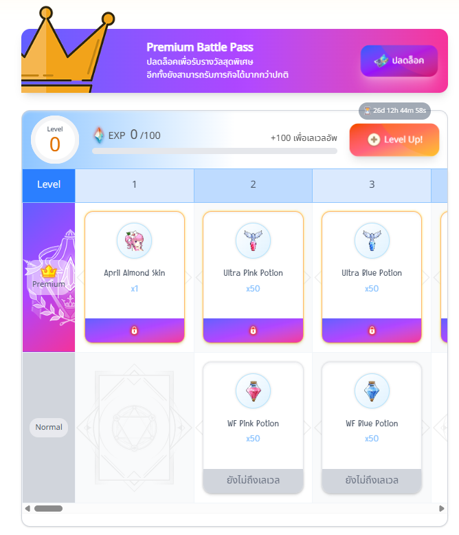 • ใช้ EXP เพื่อ เพิ่มเลเวล Battle Pass